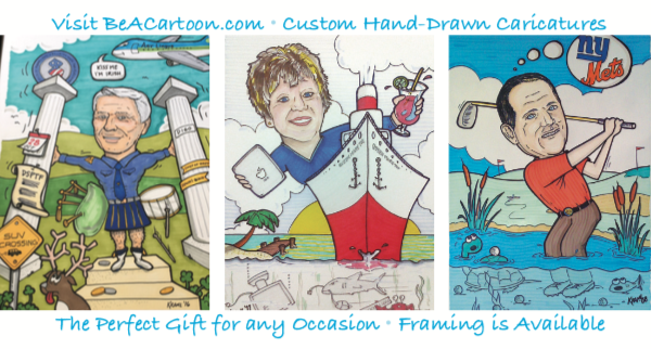 To produce the best likeness, I will need a handful of photos that show facial detail with a smile. Other useful images include their office, desk, home, school, car, pets, etc. I will also need a list of the subject's likes (sports teams, activities, foods, etc.) and any habits or idiosyncrasies. The "little" details will make the piece more funny and personal.